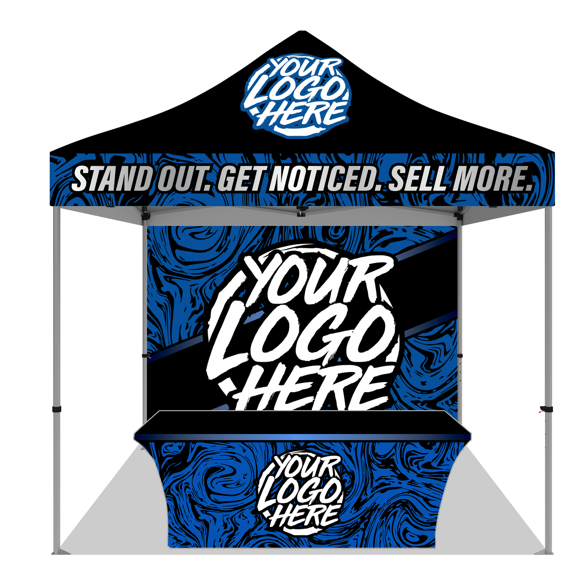 Our 10' x 10' Custom Canopy Kit #5 provides an eye catching Custom Pop-Up Canopy Tent and Rear Wall along with a Stretch Style Table Cover which helps you SIGNIFICANTLY stand out among the competition! The level of customization is endless with our Custom Booth Setups here at STX Promo where we strive to bring your Custom Canopy ideas to life to help YOU promote your Brand or Business.