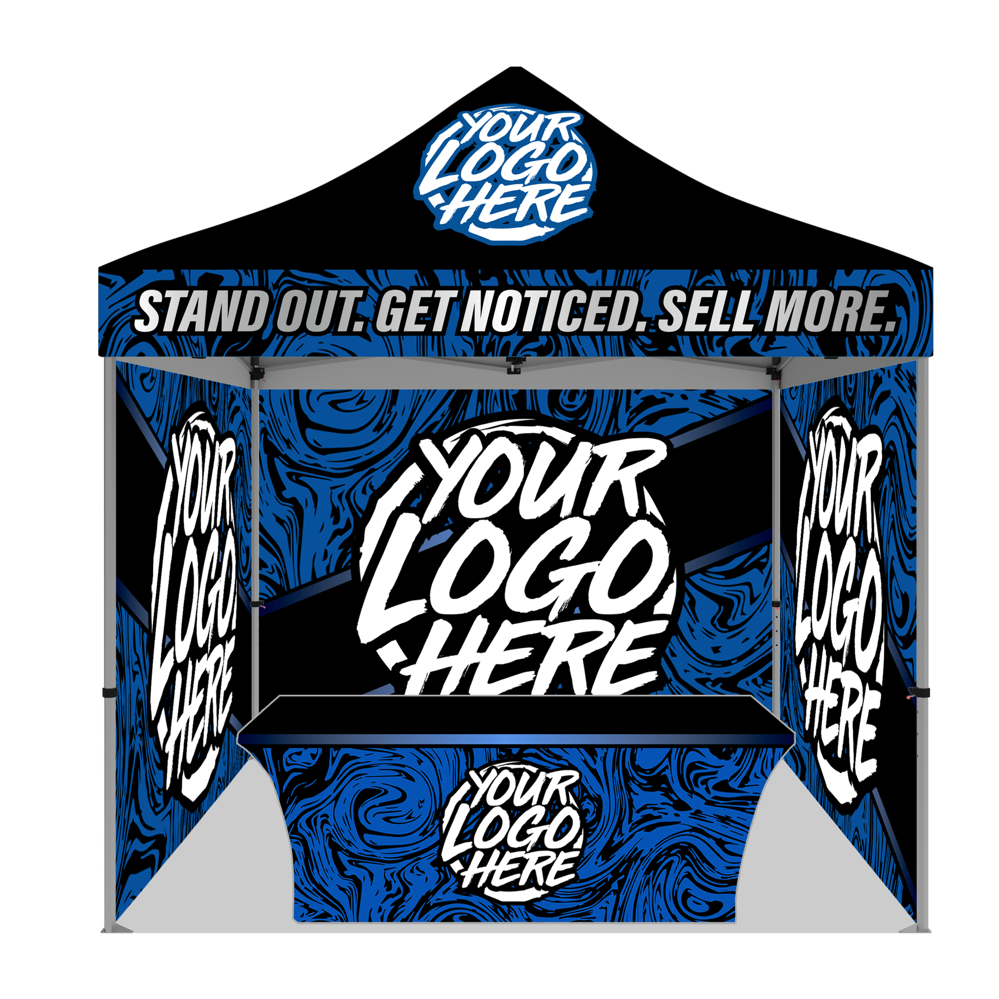 Our 10' x 10' Custom Canopy Kit #7 provides an eye catching Custom Pop-Up Canopy Tent and three Full Walls along with a Stretch Style Table Cover which helps you SIGNIFICANTLY stand out among the competition! The level of customization is endless with our Custom Booth Setups here at STX Promo where we strive to bring your Custom Canopy ideas to life to help YOU promote your Brand or Business.