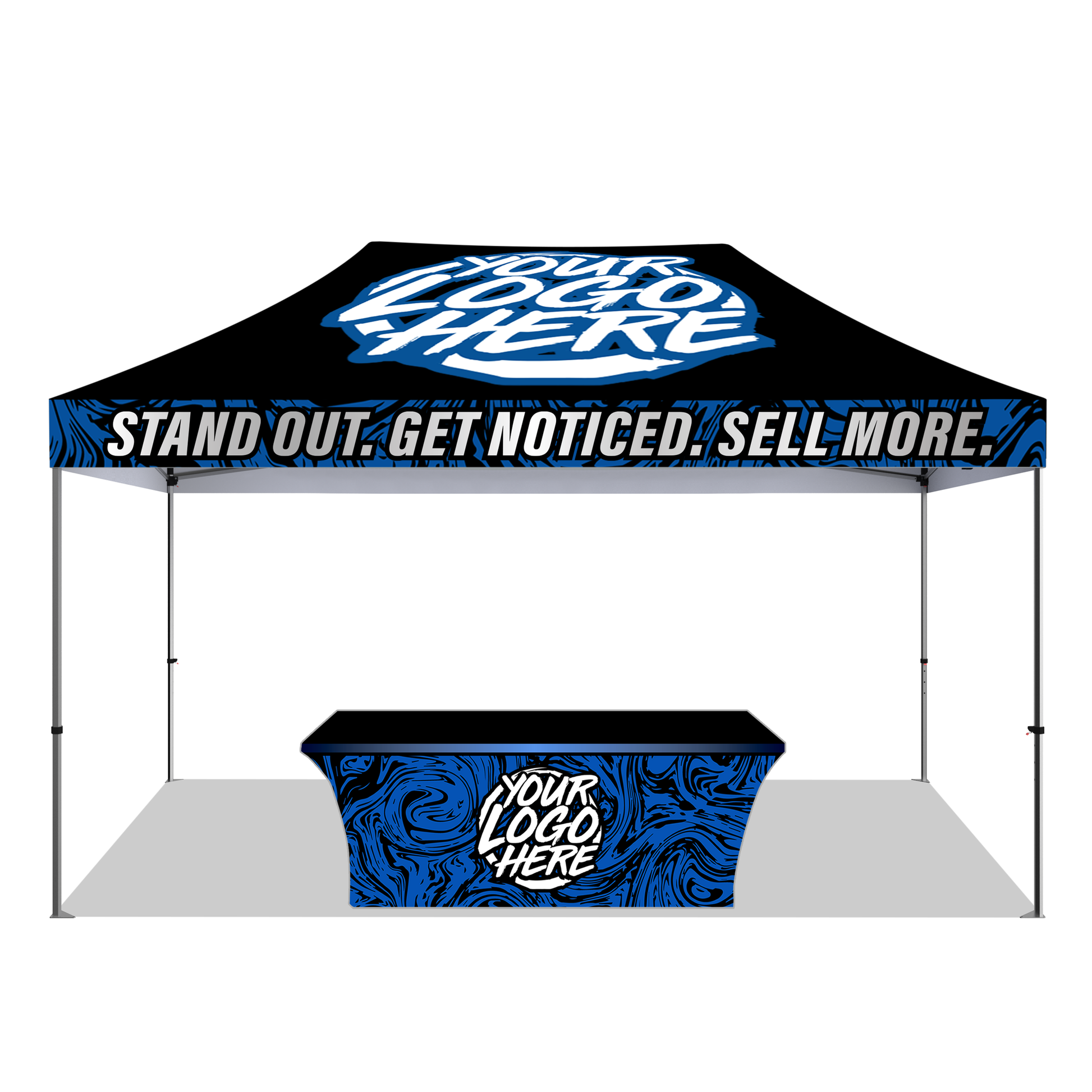 Our 10' x 15' Custom Canopy Kit #4 provides an eye catching Custom Pop-Up Canopy Tent along with a Stretch Style Table Cover which helps you SIGNIFICANTLY stand out among the competition! The level of customization is endless with our Custom Booth Setups here at STX Promo where we strive to bring your Custom Canopy ideas to life to help YOU promote your Brand or Business.