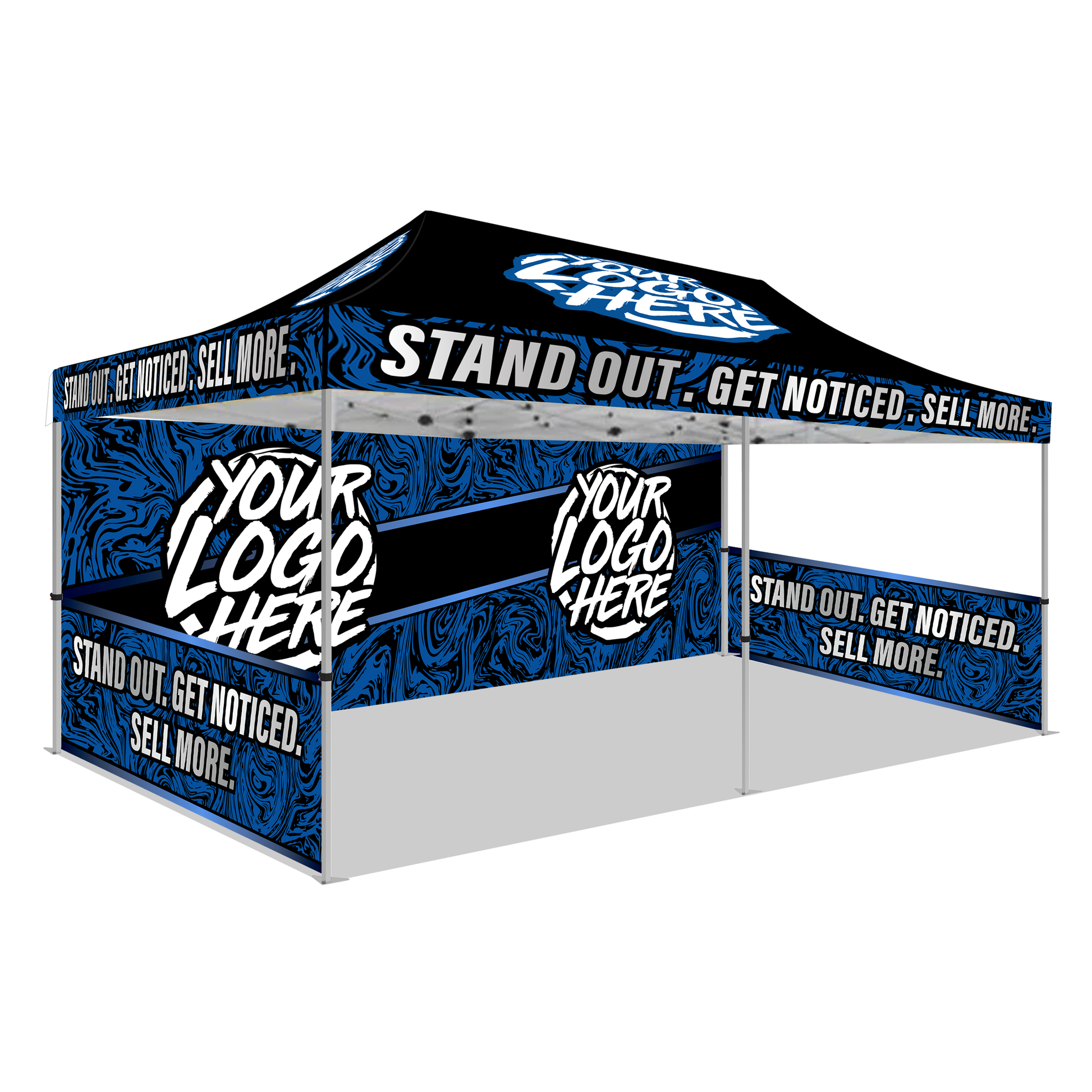 Our 10' x 20' Custom Canopy Kit #2 provides an eye catching Custom Pop-Up Canopy Tent, Rear Wall and two Half Walls which helps you SIGNIFICANTLY stand out among the competition! The level of customization is endless with our Custom Booth Setups here at STX Promo where we strive to bring your Custom Canopy ideas to life to help YOU promote your Brand or Business.